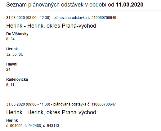 Dne 31. 3. 2020 dojde k plánovanému přerušení dodávky elektřiny, a to u nemovitostí - viz příloha